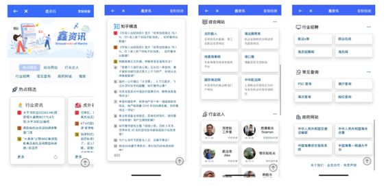 “鑫資訊”定位于為用戶(hù)提供面向海洋行業(yè)的一站式綜合信息導(dǎo)航服務(wù),不僅每日精選涵蓋航運(yùn)、海事、船舶、產(chǎn)業(yè)經(jīng)濟(jì)的行業(yè)熱點(diǎn)資訊,同時(shí)接入微博、知乎、微信及虎撲等中國(guó)主流社交媒體平臺(tái)的熱點(diǎn)話題榜,并且還提供了一站式的海洋門(mén)戶(hù)網(wǎng)站、行業(yè)達(dá)人專(zhuān)欄、行業(yè)達(dá)人自媒體、行業(yè)招聘信息、實(shí)用查詢(xún)工具、行業(yè)分管部門(mén)官網(wǎng)等導(dǎo)航入口。